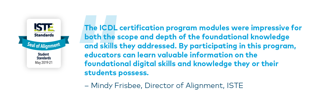 The ICDL programme received a Seal of Alignment from ISTE in May 2017. The Seal of Alignment shows that ICDL has been independently reviewed by ISTE, and was found to be aligned with the ISTE Standards.